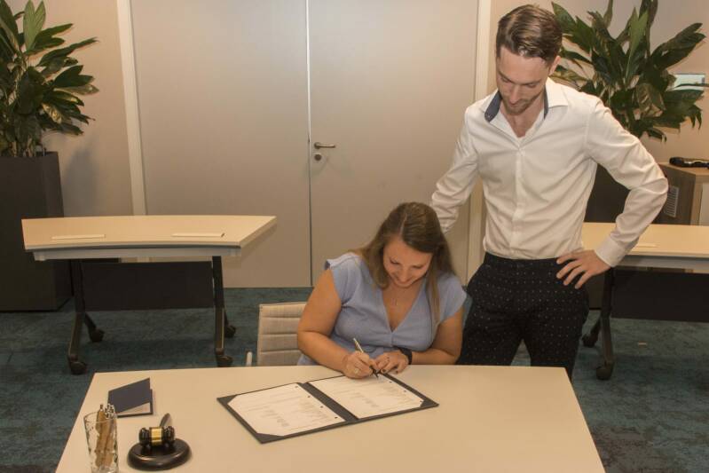 Op maandag 27 september 2021 was de raadszaal van het gemeentehuis van Waddinxveen de plek waar Anouk en Yanick hun partnerschap officieel lieten registreren. Zij vonden elkaar tijdens het introkamp van de opleiding Bewegingsthechnologie van de Haagse Hogeschool en vandaag exact 10 jaar geleden werden zij een stel. Daarom wilden zij perse vandaag deze stap zetten. In aanwezigheid van ouders, grootouders, zussen en hun vrienden wilden zij ook de komst markeren van hun eerste kindje, dat vijf weken later geboren zou worden. Het werd een emotionele, af en toe hilarische, maar vooral gezellige intieme bijeenkomst. Mijn 25e alweer en daarom ook extra gemotiveerd.