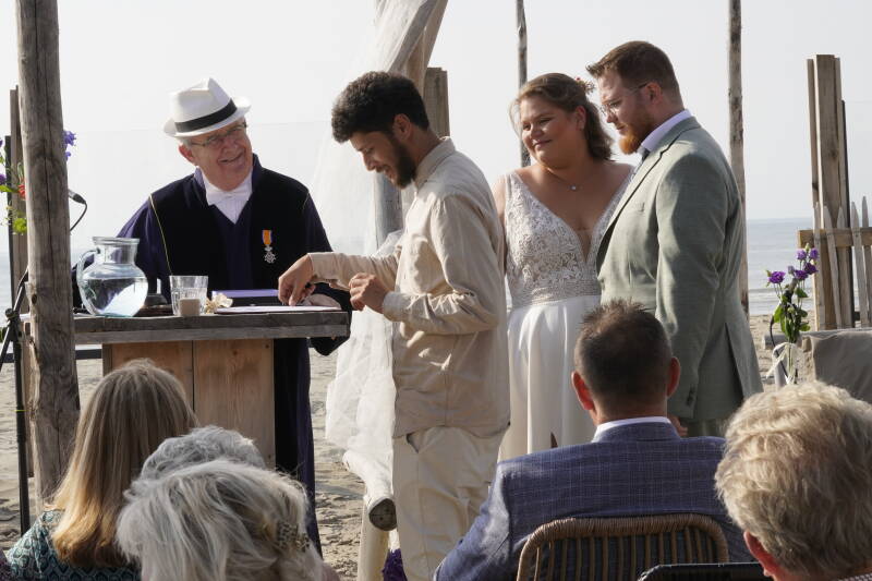 De dag na de huwelijksceremonie op het strand van Scheveningen, is op zaterdag 2 september 2023 de Ohana Beachclub op het strand van Zandvoort het decor voor de bevestiging van het huwelijk van Ann-Sofie en Dennis uit Nieuw-Vennep.