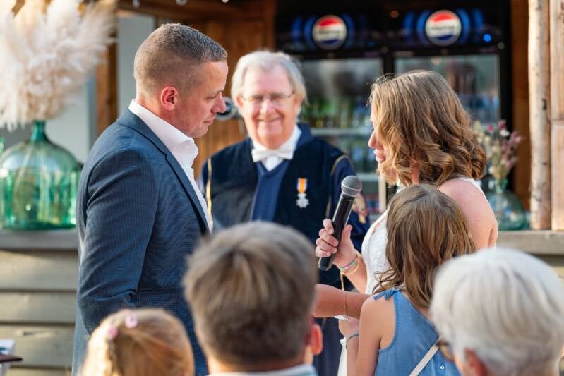 Het ringmoment, dat begon met woorden over eeuwige cirkels en verbondenheid, werd daadkrachtig op de kaart gezet door Sara, die papa en mama de ringen aan elkaars vingers liet zetten.