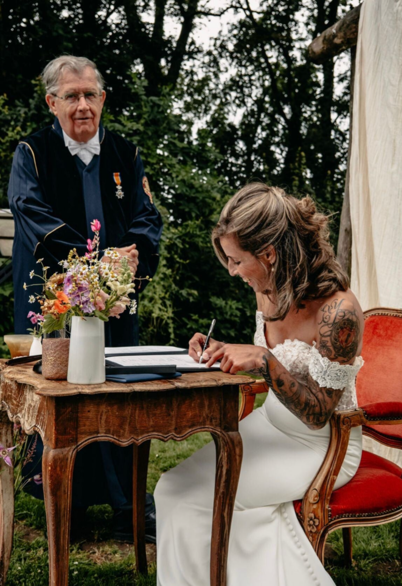 Na het JA-woord en de ringceremonie volgt het ondertekenen van de huwelijksakte, waarbij als getuige voor Ryanne haar broer en haar beste vriendin de akte mogen ondertekenen.