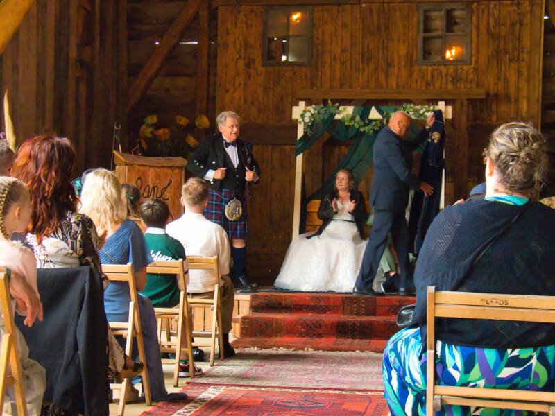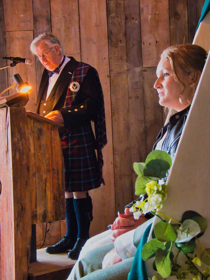 Met die kennis in het achterhoofd was het voor hen niet moeilijk om voor mij als trouwambtenaar te kiezen en het was dan ook van meet af aan duidelijk, dat ook ik mij aan het thema zou aanpassen en onder de toga het Schotse galakostuum zou dragen.