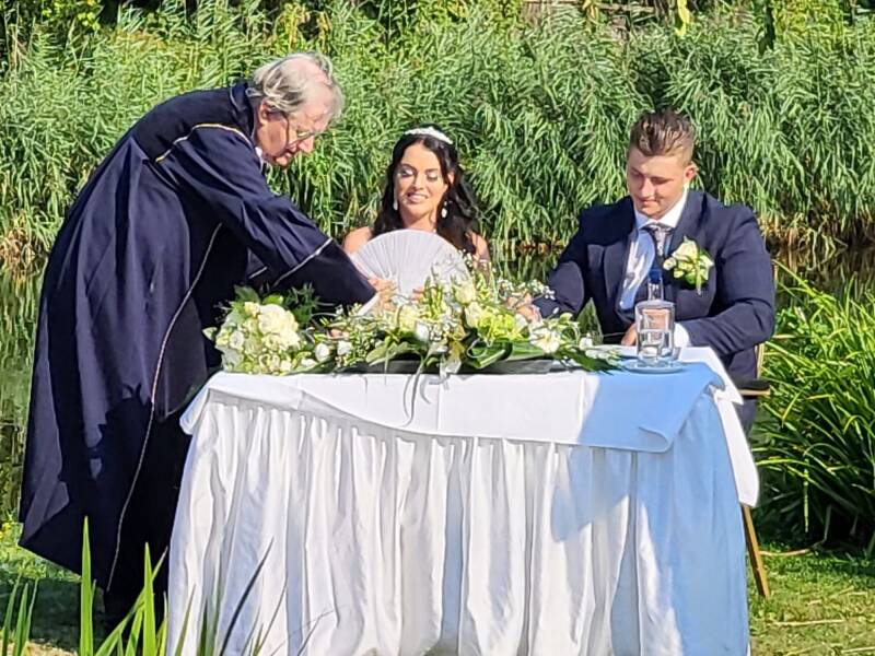 Het was weer eens wat anders om deze vooral uitermate vrolijke ceremonie te mogen doen en het was een bijzondere ervaring om de voorbereidende gesprekken met Mathew en Pascalle in aanwezigheid van beide moeders te hebben mogen doen.